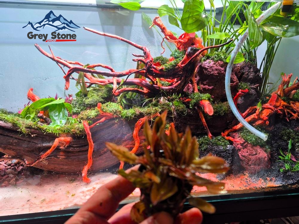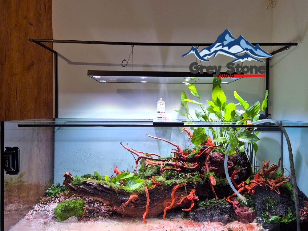 W akwarium stworzyłem unikalną dekorację, która przyciąga wzrok. Centralnym punktem jest długi, poziomo ułożony korzeń rzeczny. Do niego przymocowałem mniejsze kawałki red moorów, które dodają naturalnego charakteru i harmonii. Obsadziłem ten korzeń różnorodnymi roślinami, które mają potencjał do osiągnięcia znacznego progresu. Oczywiście, zdaję sobie sprawę, że aby akwarium prezentowało się zgodnie z moimi założeniami, rośliny muszą odpowiednio rosnąć i rozwijać się.