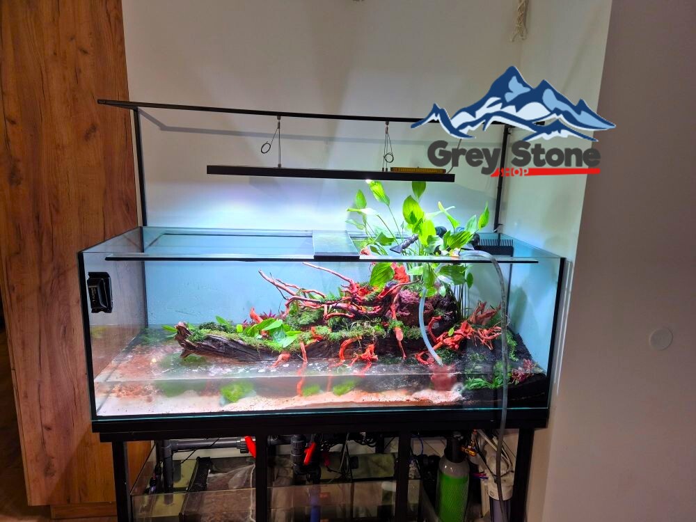 Chciałbym podzielić się z Wami moim najnowszym projektem – akwarium o pojemności 600 litrów, które z dumą oświetla jedna z najlepszych lamp dostępnych na rynku dla akwarystyki roślinnej, czyli masywny Skylight Hyperspot w wersji FL. To oświetlenie nie tylko zapewnia doskonałe warunki do wzrostu roślin, ale także nadaje niesamowity blask całemu zbiornikowi.