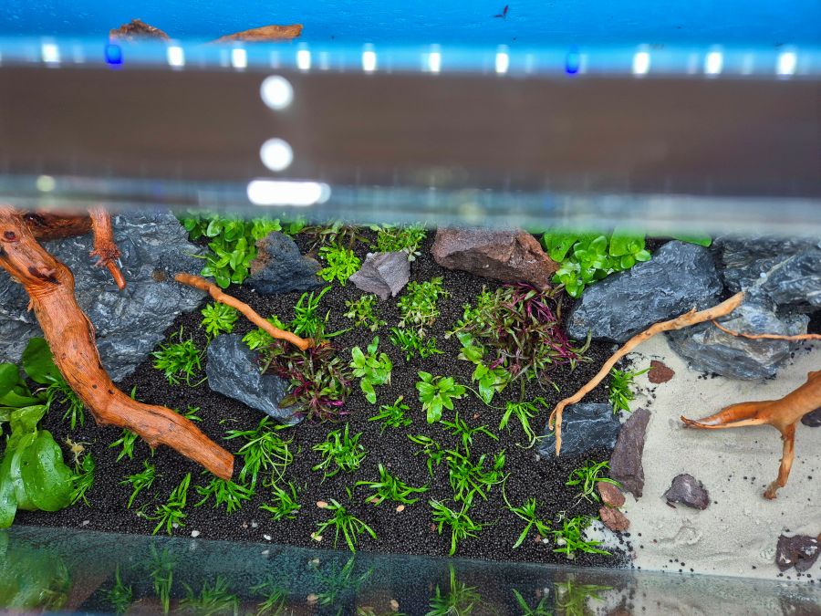 W akwarium na żyznym podłożu aktywnym zasadziliśmy różnorodne rośliny, które w niedługim czasie stworzą zachwycającą scenerię, wypełniając zbiornik kolorami. Zastosowane przez nas rośliny, takie jak Lileopsis brazylijski, Pogostemon erectus, Cryptocoryne oraz różne gatunki Rotali (w tym kilka ich odmian) to tylko niektóre z ciekawych łodygowców, które wybraliśmy.