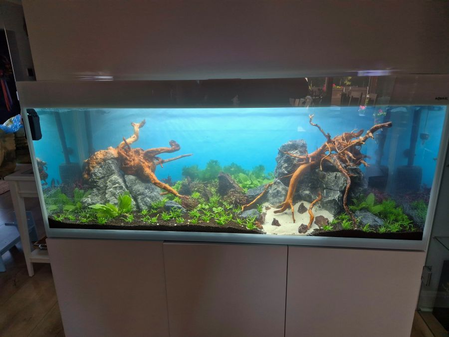 Oświetlenie w zbiorniku to pokrywa glossy z trzema belkami które współpracują z systemem CO2 sterowanym komputerowo. Taka kombinacja z pewnością przyniesie świetne efekty, a my już nie możemy się doczekać pierwszych rezultatów. Wierzymy, że wkrótce ujrzymy bujną roślinność oraz intensywne kolory, które ożywią zbiornik.