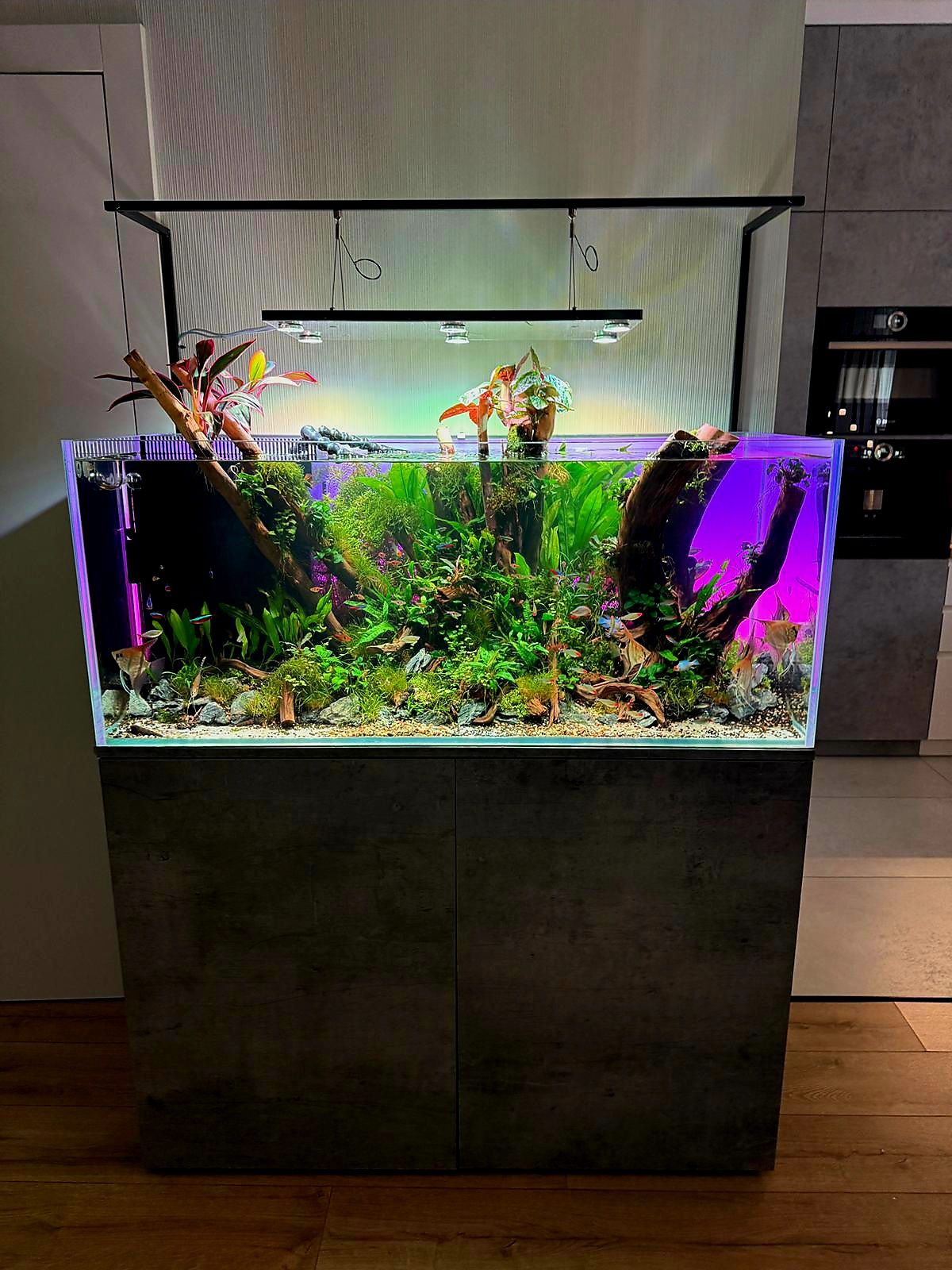 - Oświetlenie LED: Niezbędne dla wzrostu roślin i wydobycia uroku podwodnego świata. Nie służy do nieustannego wpatrywania się w rybki, ma działać przez 8-10 godzin na dobę.