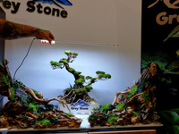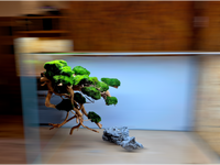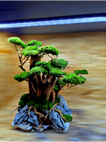Bonsai jest osadzone na skale dragon stone, co nadaje mu dodatkowego uroku. U podnóża drzewka znajdują się akcenty w postaci mini bonsai anubiasów, które doskonale komponują się z całością i tworzą malowniczy krajobraz podwodny.