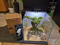 Aranżacja drzewka w zestawie z akwarium jest ręcznie klejona, co gwarantuje nie tylko unikalność, ale także łatwość w utrzymaniu. Żywy mech, który jest częścią tego projektu, nie wymaga intensywnego nawożenia ani długotrwałego natężenia światła